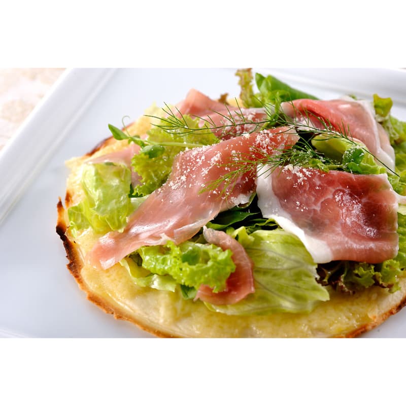 豚もも肉を、ドイツの岩塩を使用し塩せきした、豚肉のまろやかな味わいが楽しめる生ハムです。半解凍状態でお召上がりください。メロンや洋なし等の果物に巻いて食べるとお洒落な一品が出来上がります。大葉や胡麻などお好みの混ぜご飯を丸くして生ハムで包んだ手毬寿司もオススメです。