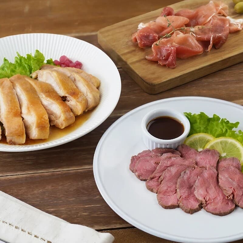 食べ切りサイズのローストビーフ、上質な味わいの生ハム、肉厚で柔らかな照り焼きチキンのセットです。ご自宅で肉バル気分を味わえる肉尽くしの食卓でワインと一緒にお楽しみください。