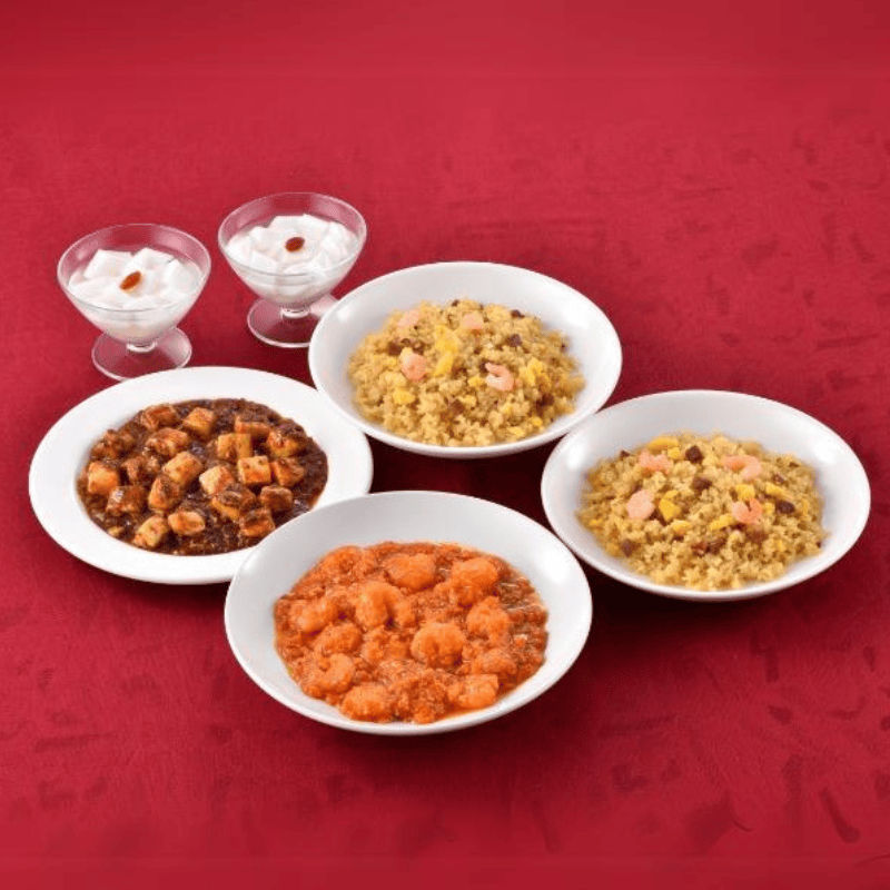 本格四川麻婆豆腐150g×1、ふっくら五目炒飯(200g×2)×1、乾焼蝦仁(エビチリソース)150g×1、杏仁豆腐500g×1 ※パッケージデザインが変更になる場合がございます。