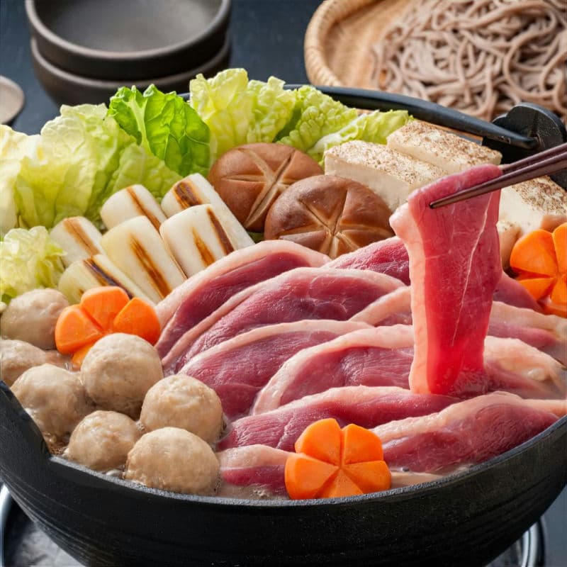 【内容量】鴨鍋セット4人前【(合鴨ロース約130g・合鴨つくね6個・五割そば200g)×各2、(鴨だし濃縮スープ30g・山椒0.2g)×各4】
