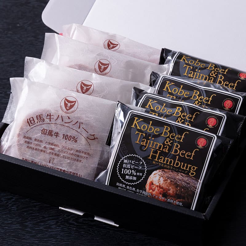 〈内容〉【牛肉(神戸牛・但馬牛)100%】ハンバーグ×4個、【但馬牛100%】ハンバーグ×4個