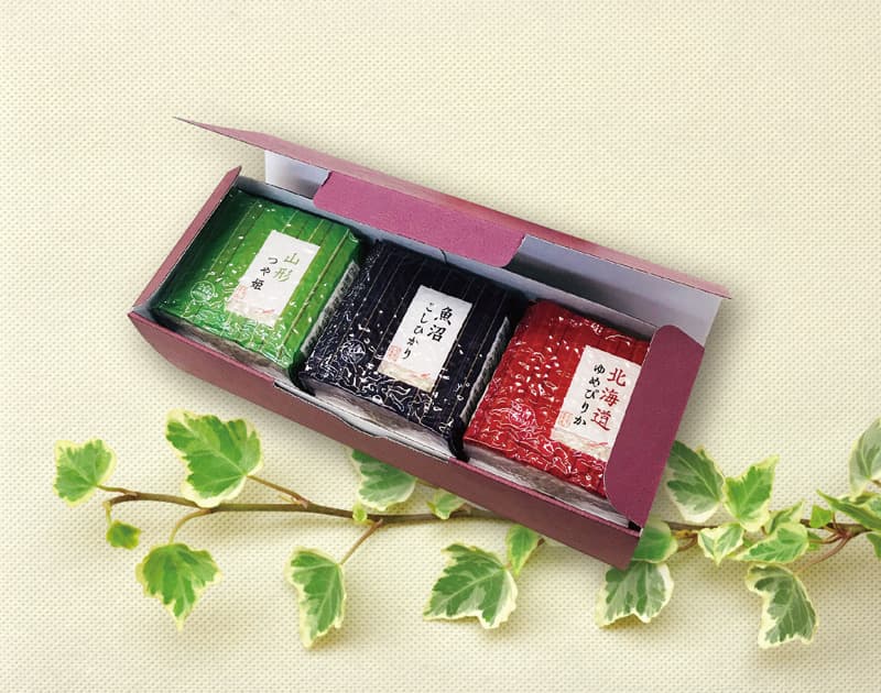 各2合という食べやすい量で、食べ比べに人気の3種の銘柄をチョイス。各地の特色が感じられるお米をお楽しみいただけます。