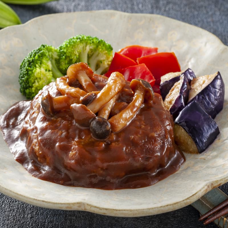 牛肉の旨味が凝縮された柔らかいハンバーグと一緒に、野菜もバランスよく添えた一皿です。レンジで温めるだけで美味しくいただけます。銀座の割烹「よし田」監修。