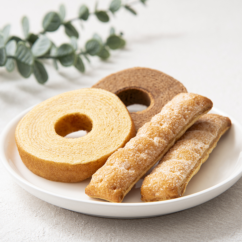 ふんわりやさしい味わいのミニバウムと、サクサク食感が楽しめるスティックパイ。