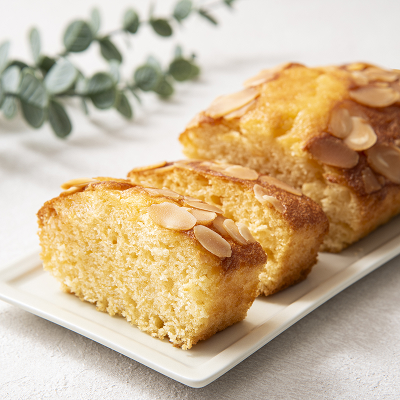 表面にたっぷり散りばめられたスライスアーモンドが目を引く、ふっくらとしたパウンドケーキ。
