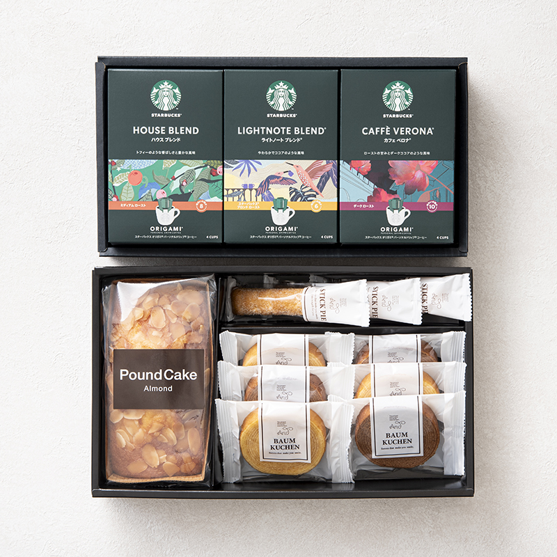 【商品内容】スターバックスオリガミドリップコーヒー(ハウスブレンド・カフェベロナ・ライトノートブレンド)9g×各4、バウムクーヘン(ココア・バニラ)各3、スティックパイ(プレーン)×3、アーモンドパウンドケーキ