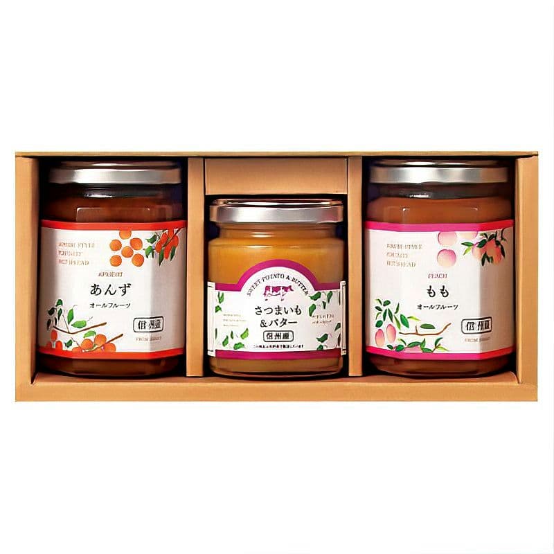 【商品内容】あんずスプレッド140g、ももスプレッド140g、さつまいも&バターペースト110g