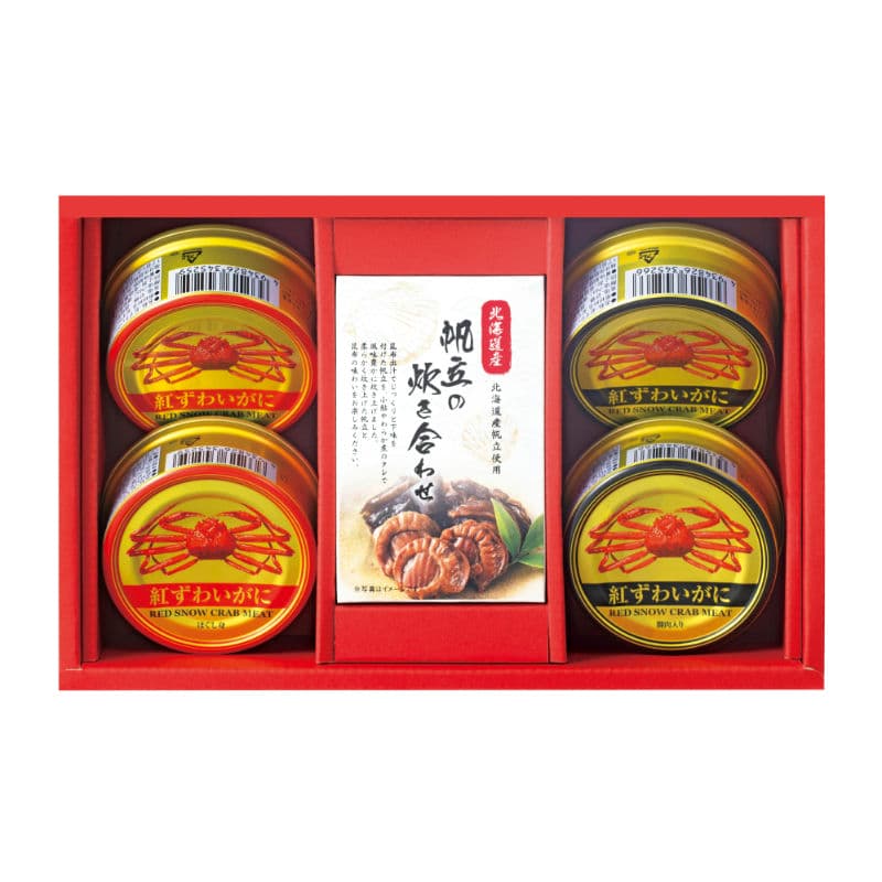 【商品内容】紅ずわいがに(ほぐし身)55g×2、紅ずわいがに(脚肉入り)55g×2、帆立炊き合わせ35g