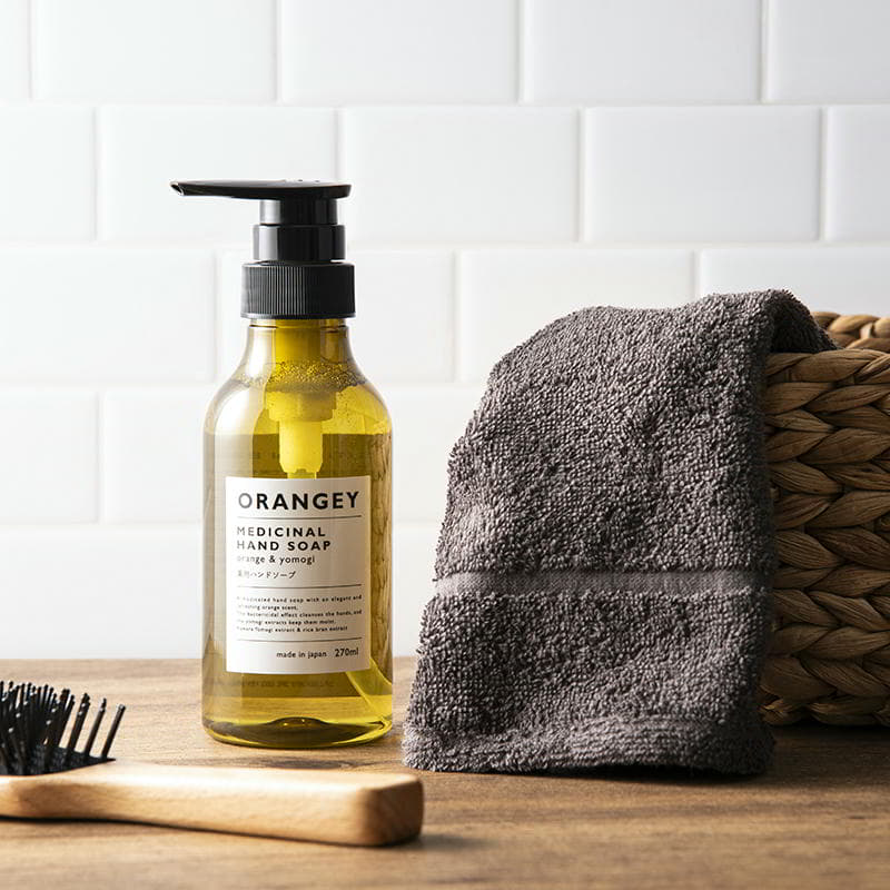オレンジとハーブの爽やかな香りの薬用ハンドソープと、肌にやさしいオーガニックタオルのセット。