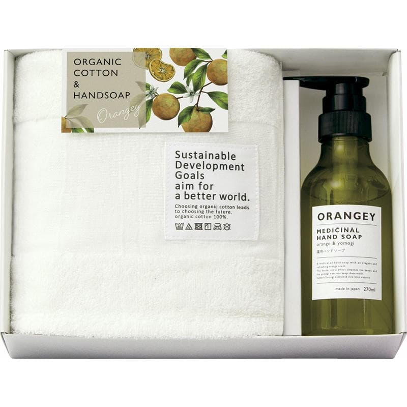 オレンジとハーブの爽やかな香りの薬用ハンドソープと、肌にやさしいオーガニックタオルのセット。