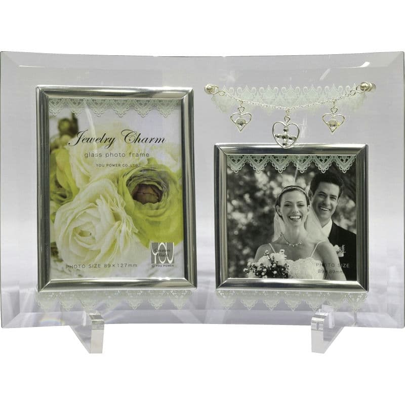 クリアのガラスにハート型のチャームが付き。ガラス面にシルバーカラーのレースをプリント。