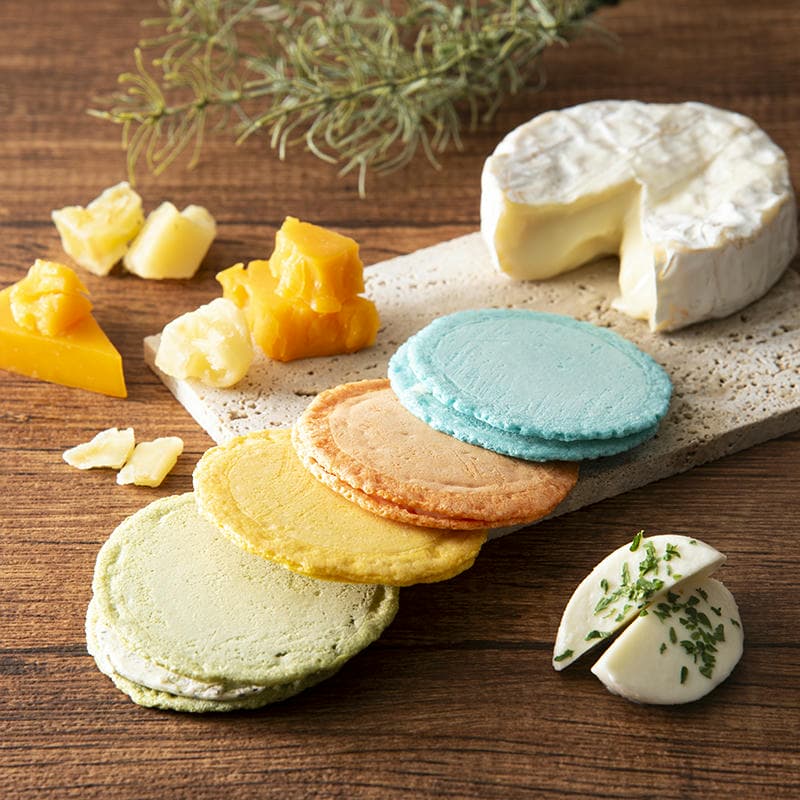 軽くて口溶けが良い薄焼きのえびせんべいに、4種の本格チーズソースをサンドした新感覚スナックです。4種類のチーズそれぞれに合う素材を組み合わせたこだわりのチーズソースは、お酒のお供にもおすすめ。