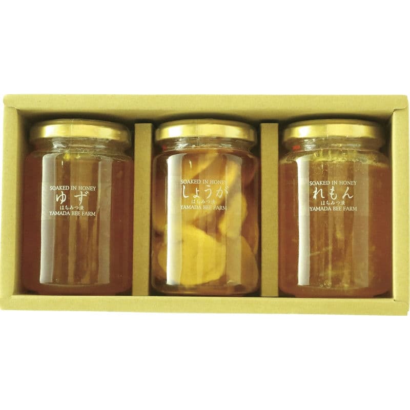 選び抜いた素材をはちみつに漬け込んだ3種類のはちみつ漬詰合せ。しょうが漬は飲み物やお料理に、ゆず漬やレモン漬はトーストやヨーグルトに。