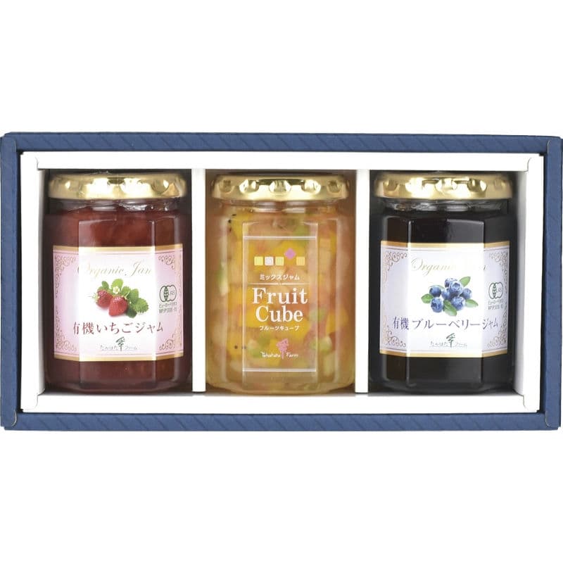 【セット内容】ミックスジャム(フルーツキューブ)(155g)・オーガニックジャム(有機いちご・有機ブルーベリー)(各145g)×各1