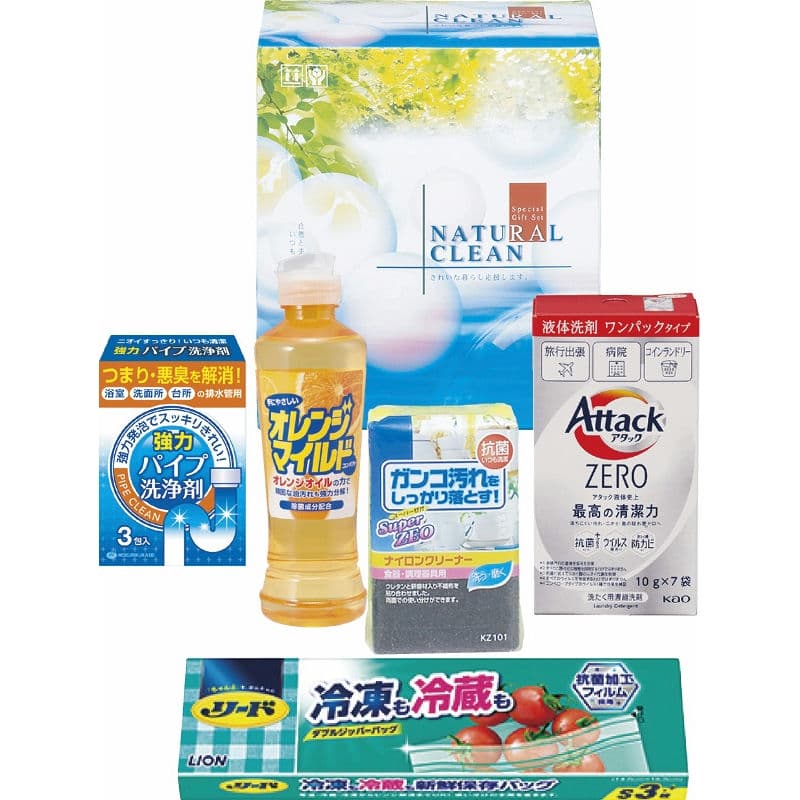 【セット内容】花王アタックZEROワンパック(10g×7袋)・オレンジマイルドコンパクト(270ml)・パイプ洗浄剤(3包入)・リード冷凍も冷蔵も新鮮保存バッグ(タイ)(S3枚)・抗菌ナイロンクリーナー×各1