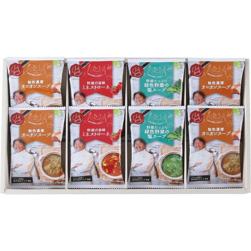 【セット内容】オニオンスープ×4、ミネストローネ・緑色野菜の塩スープ×各2