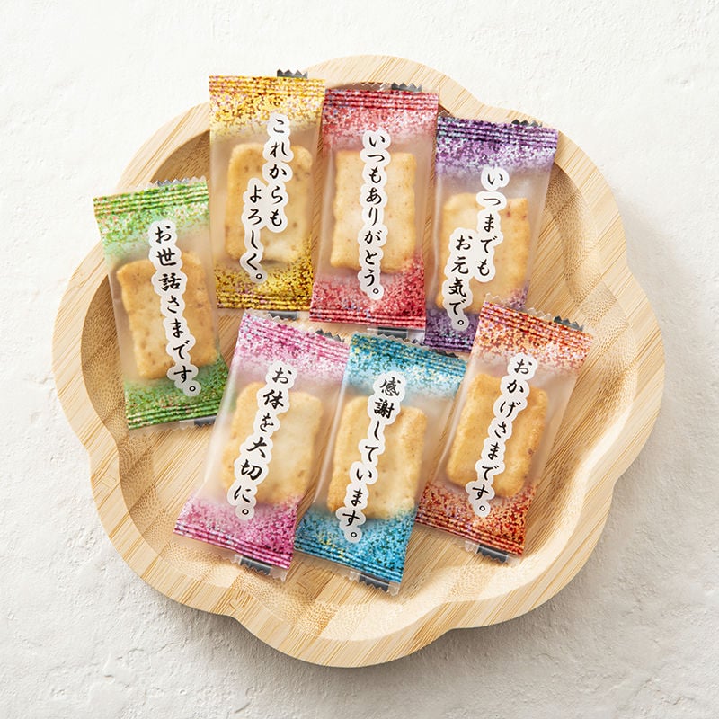 個包装されているおかきには、「いつもありがとう」「これからもよろしく」「いつまでもお元気で」など、感謝や思いやりが伝わる、7つの言葉がプリントされています。
