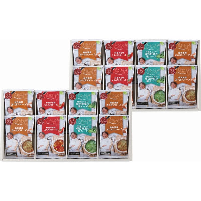 【セット内容】オニオンスープ×8、ミネストローネ・緑色野菜の塩スープ×各4