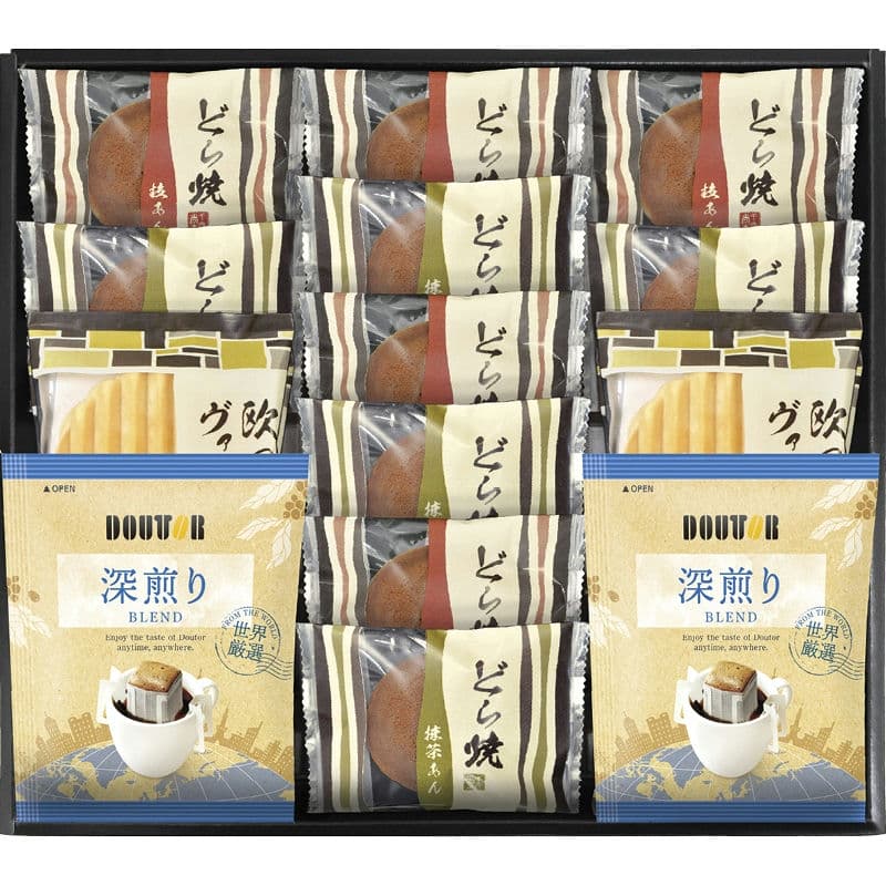 【セット内容】どら焼き(粒あん・八女抹茶あん)×各5、ドトールドリップコーヒー(7g)・欧風ヴァッフェル×各2
