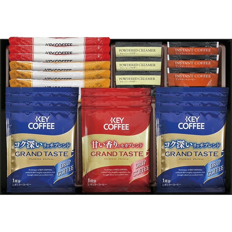 【セット内容】ドリップコーヒー(リッチブレンド)×6、ドリップコーヒー(モカブレンド)・スティックコーヒー(カフェモカ)(7.8g)・スティックコーヒー(カフェオレ)(7g)・クリーミーパウダー(2.5g)・インスタントコーヒー(2g)×各3