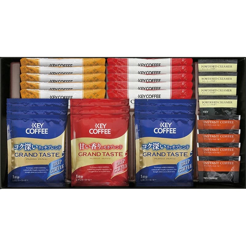 【セット内容】ドリップコーヒー(リッチブレンド)×6、スティックコーヒー(カフェモカ)(7.8g)・スティックコーヒー(カフェオレ)(7g)×各5、クリーミーパウダー(2.5g)・インスタントコーヒー(2g)×各4、ドリップコーヒー(モカブレンド)×3