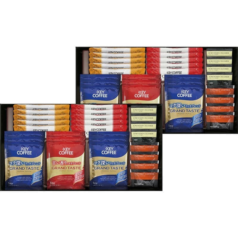 【セット内容】ドリップコーヒー(リッチブレンド)×12、スティックコーヒー(カフェモカ)(7.8g)・スティックコーヒー(カフェオレ)(7g)×各10、クリーミーパウダー(2.5g)・インスタントコーヒー(2g)×各8、ドリップコーヒー(モカブレンド)×6