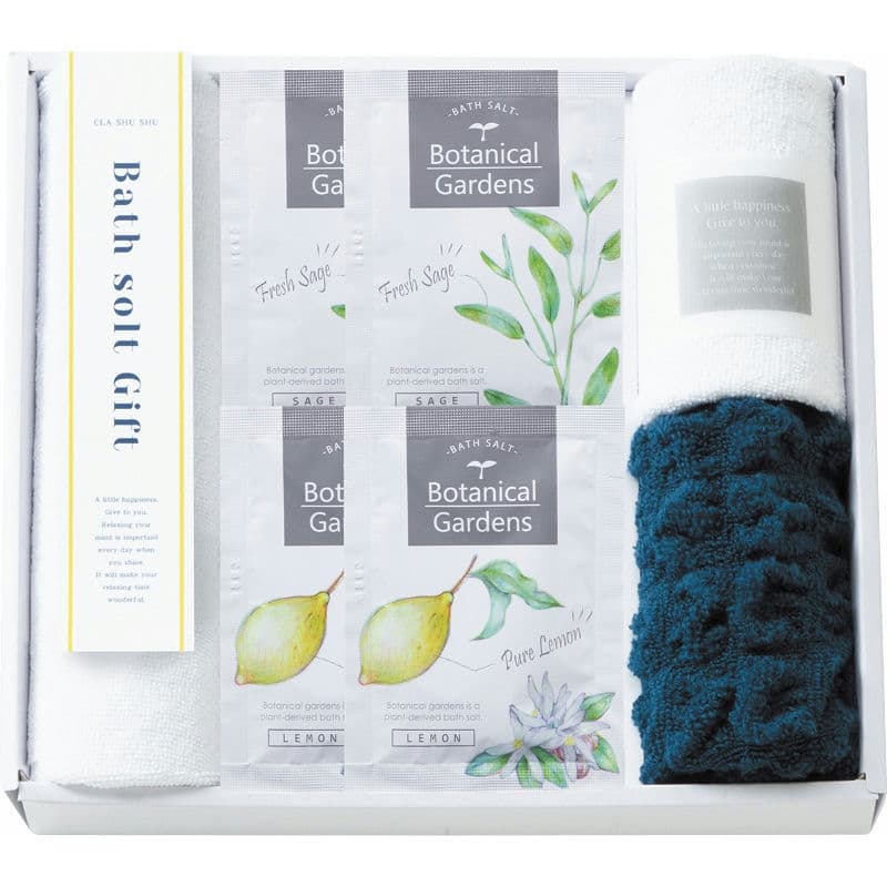 【セット内容】バスソルト(レモン・セージ)(各25g)・マイクロファイバークロス(中国)(25×25cm)×各2、ふわもこウォッシュタオル(中国)(22×22cm)×1