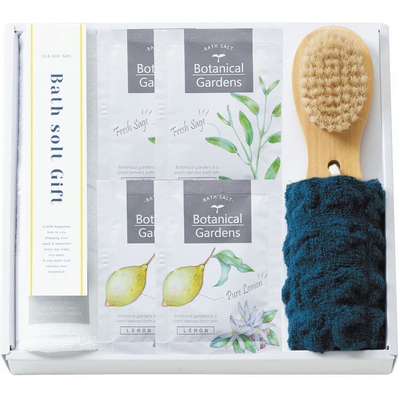 【セット内容】バスソルト(レモン・セージ)(各25g)・マイクロファイバークロス(中国)(25×25cm)×各2、ふわもこウォッシュタオル(中国)(22×22cm)・ブラシ(中国)(豚毛)×各1