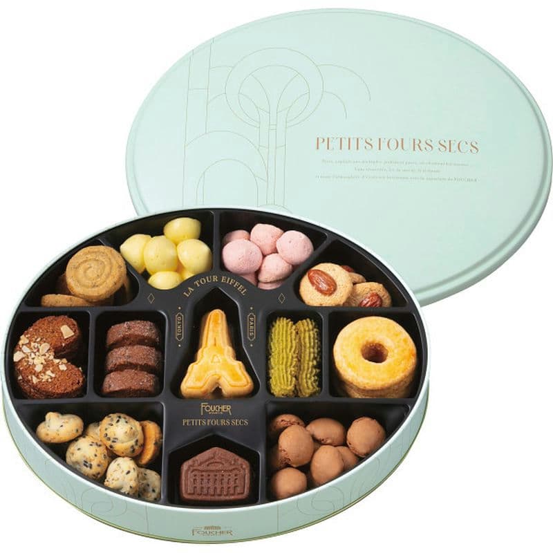 フーシェ人気のクッキー缶。様々な素材を使用して、遊び心たっぷりに仕上げた12種の焼菓子詰合せ。エッフェル塔やオペラ座をイメージしたクッキーを中心に、フルーツ焼きメレンゲやピスタチオのクッキーなど、どこかパリの街並みを感じる詰め合わせです。