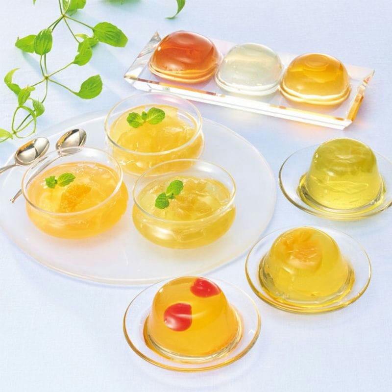 ほどよい酸味の山形県産ラ・フランスの上品な香りと舌触りを楽しめる「ラフランスジュレ」、ジューシィでとろけるような食感の「マンゴージュレ」、モチモチ食感の葛ゼリーなど多彩な味わい。暑い季節に嬉しい爽やかなギフトです。