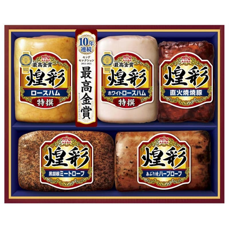 【煌彩 特撰ロースハム】豚ロース肉、還元水あめ、食塩/調味 料(アミノ酸)、リン酸塩(Na)、酸化防止 剤(ビタミンC)、発色剤(亜硝酸Na)、香 辛料抽出物、(一部に豚肉を含む)