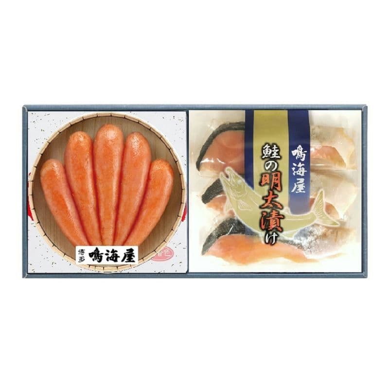 鳴海屋の素材を生かし味わい深く仕上げた辛子明太子と明太子のつけダレでじっくり漬け込んだ旨味たっぷりの鮭の明太漬けとのセットです。