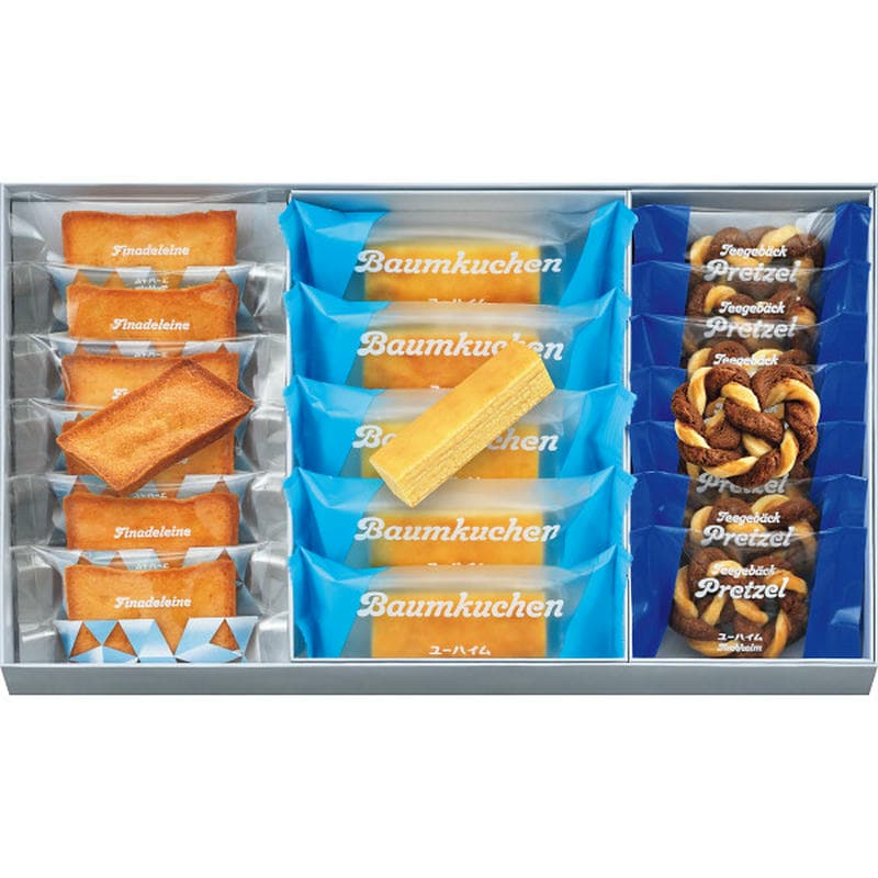 ユーハイム自慢のバウムクーヘンとパイ生地とビスケット生地をねじり合わせたプレッツェル型のクッキー、冷やしてもおいしいフィナンシェ×マドレーヌの新しい焼き菓子「フィナドレーヌ」を詰め合わせた夏限定の焼き菓子セット。