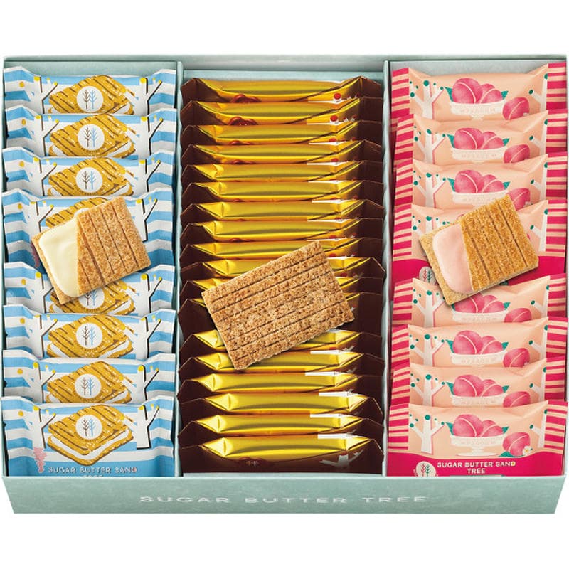 シリーズ一番人気の「シュガーバターサンドの木」、「白桃ミルクショコラ・シュガーバターの木」と「焦がしバターキャラメル」が入った華やかなひと箱。
