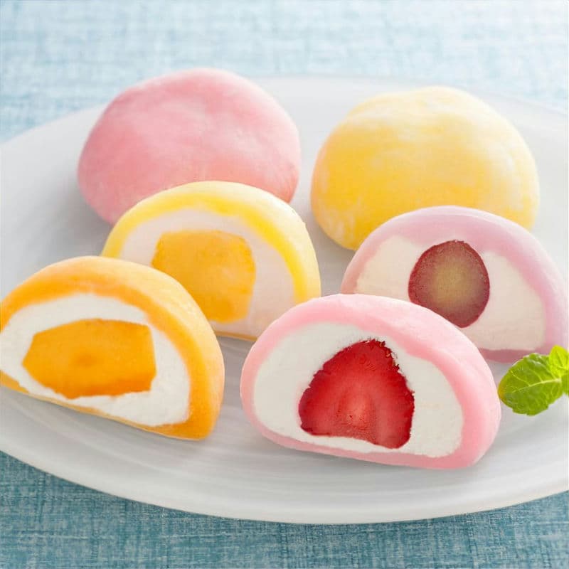 いちご・マンゴー・ぶどう・パインの果肉とクリームを、やわらかなお餅で包んだカラフルな一品。