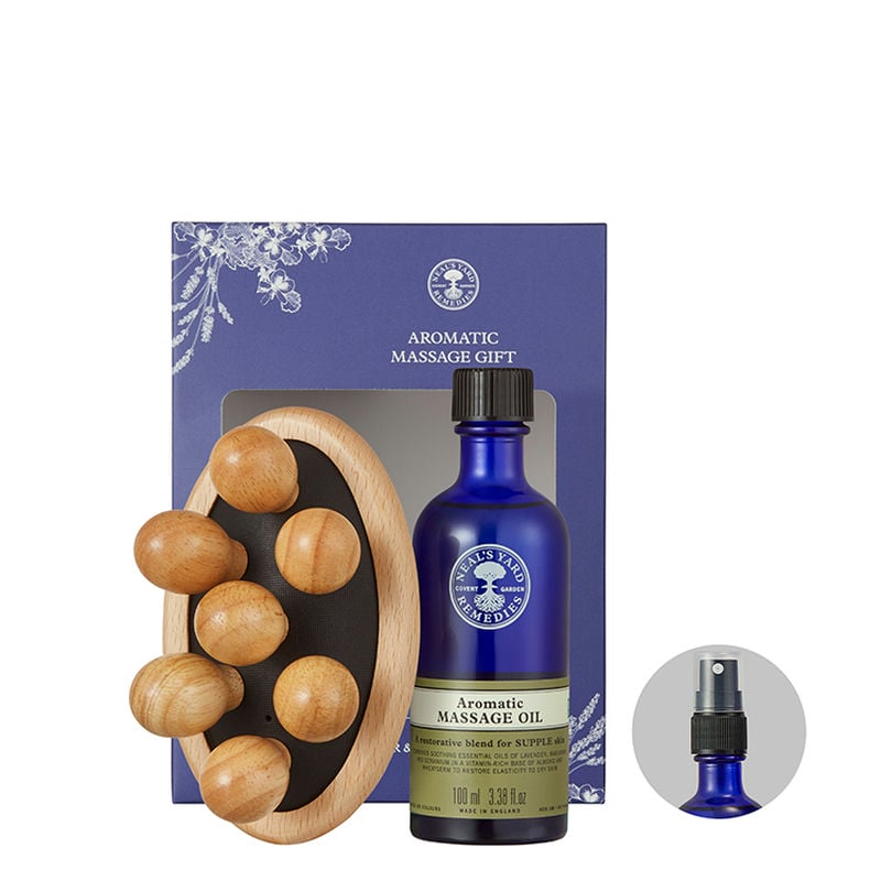 ラベンダーやゼラニウムが香るボディオイルとマッサージローラーで疲れた身体を解きほぐすケアセット。