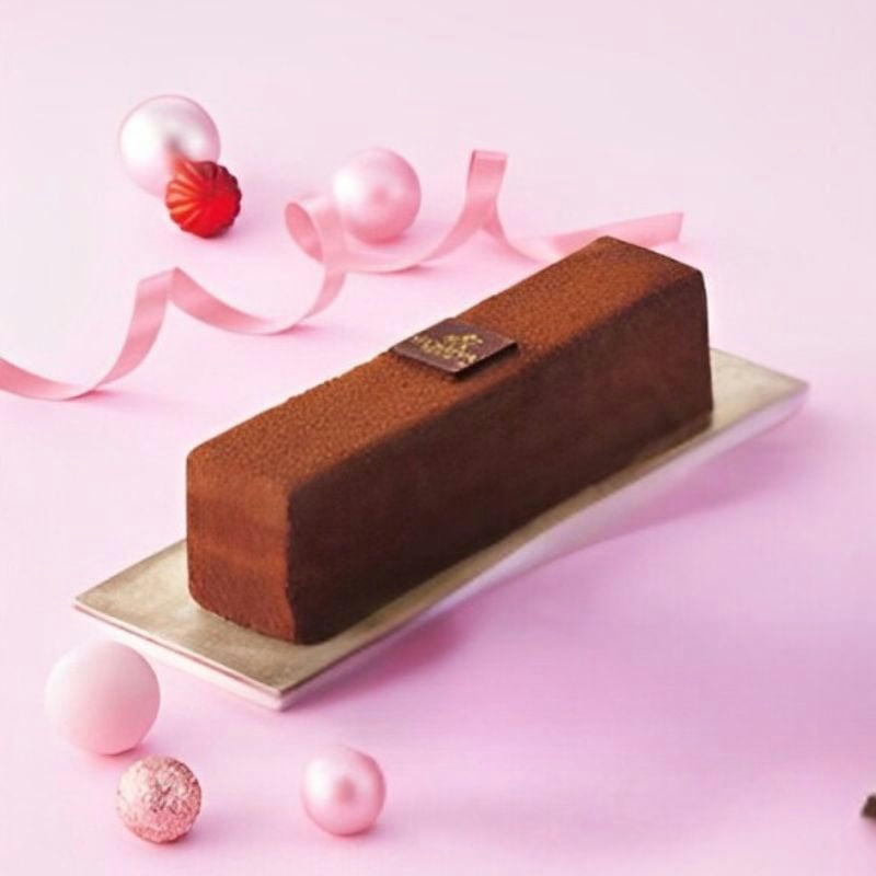 ココアパウダーを練り込んでしっとりとした食感に焼き上げた生地で、なめらかなチョコレートガナッシュクリームをロール。デコレーションにも同じクリームを使用しています。