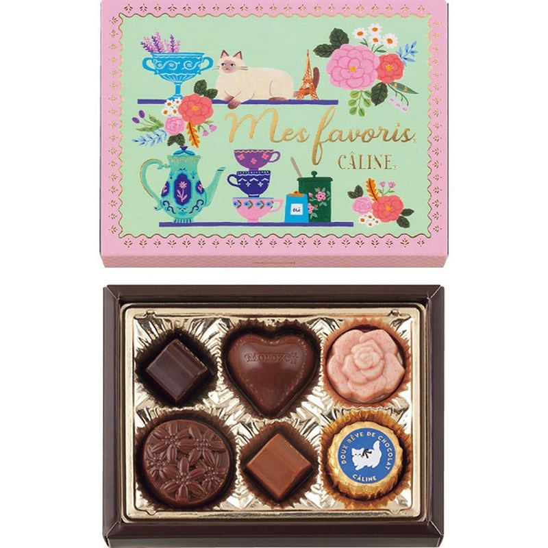 ステージ上の2匹の猫とお花を描いた楽しいイエローのパッケージに、バラやハートなど、さまざまな形のチョコレートを詰め合わせました。