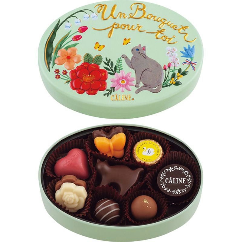 パリを散歩する猫を描いたグリーンの缶パッケージに、ハートやバラ、猫の形のチョコレートなど見た目もかわいいチョコレートが入っています。