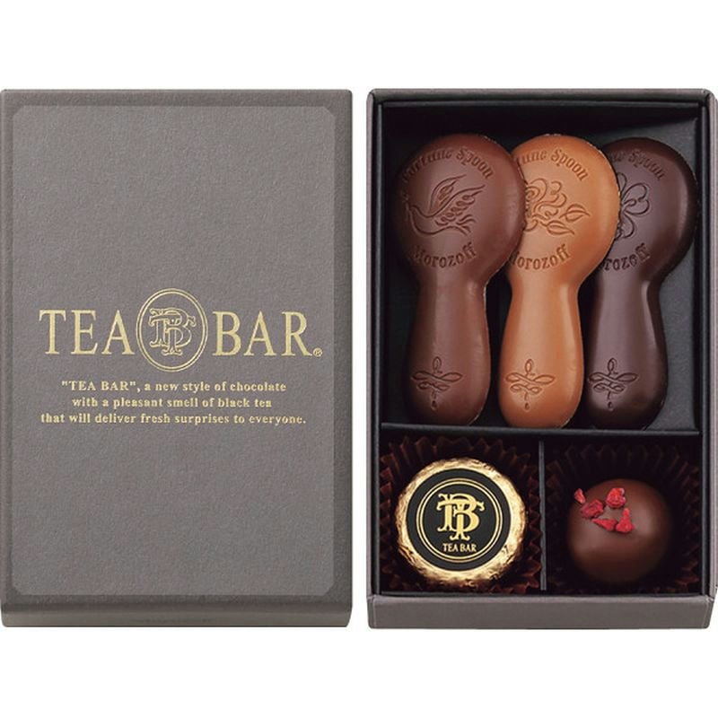 あたたかみのあるグレーのパッケージに、幸運モチーフを刻印したティーキャディスプーン型チョコレートや、紅茶のガナッシュ入りミニトリュフが入っています。