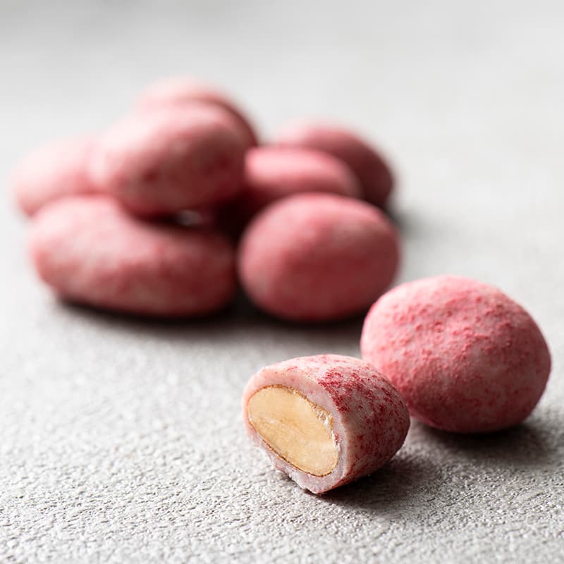 カラメルに包まれたアーモンドをホワイトチョコレートとフランボワーズパウダーでコーティングしました。甘酸っぱさとアーモンドのコクが絶妙に調和します。