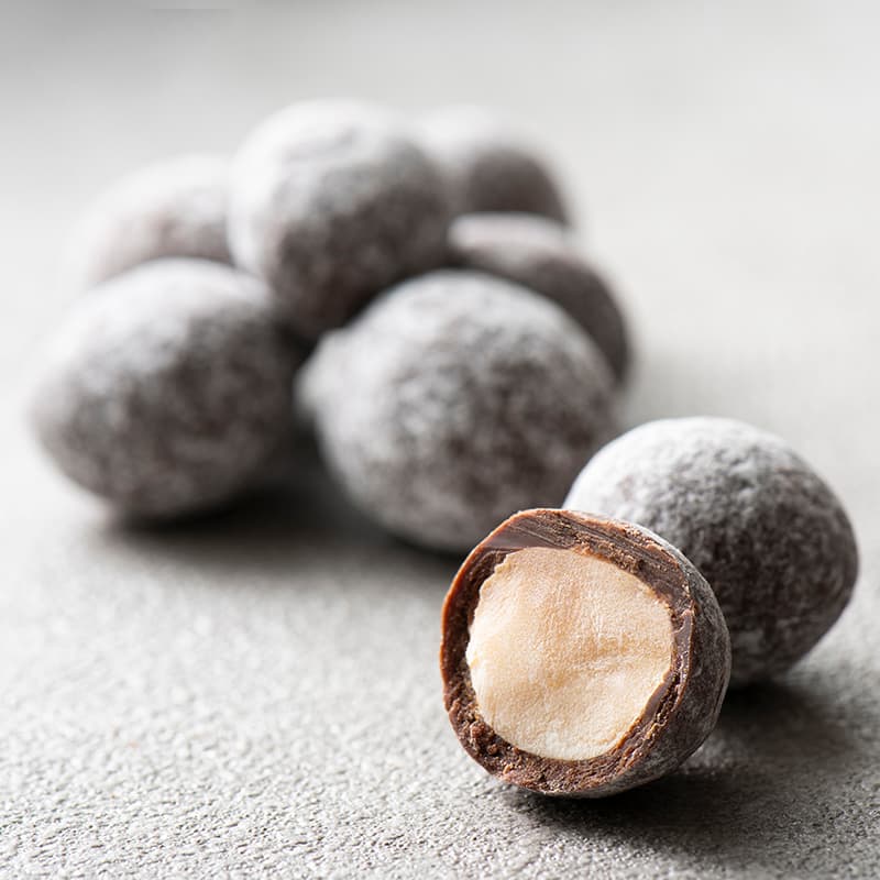 ダークチョコレートとミルクチョコレートをブレンドし、薄くキャラメリゼした大粒のマカダミアナッツをコーティング。一口食べると、ナッツの豊かな風味とチョコレートの深い味わいが広がります。