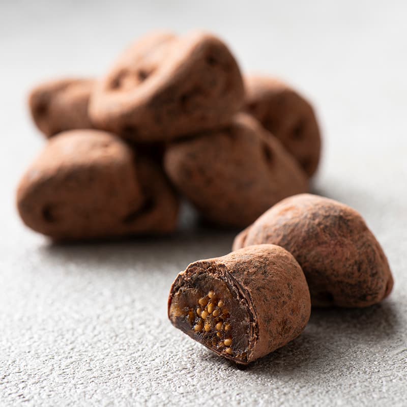 洋酒が香るドライいちじくをスペイン産ビターチョコレートで包みました。ワインやウイスキーなどのお酒にも合う大人なトリュフです。