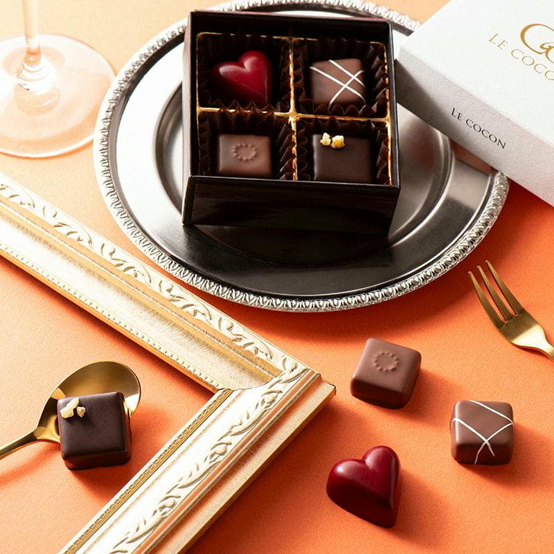 上質な素材を使い、一つひとつ丁寧に手作業で作り上げる、ル ココンのボンボンショコラ。詰め込まれたガナッシュやジュレに個性が光る、選りすぐりの4種類をお楽しみください。