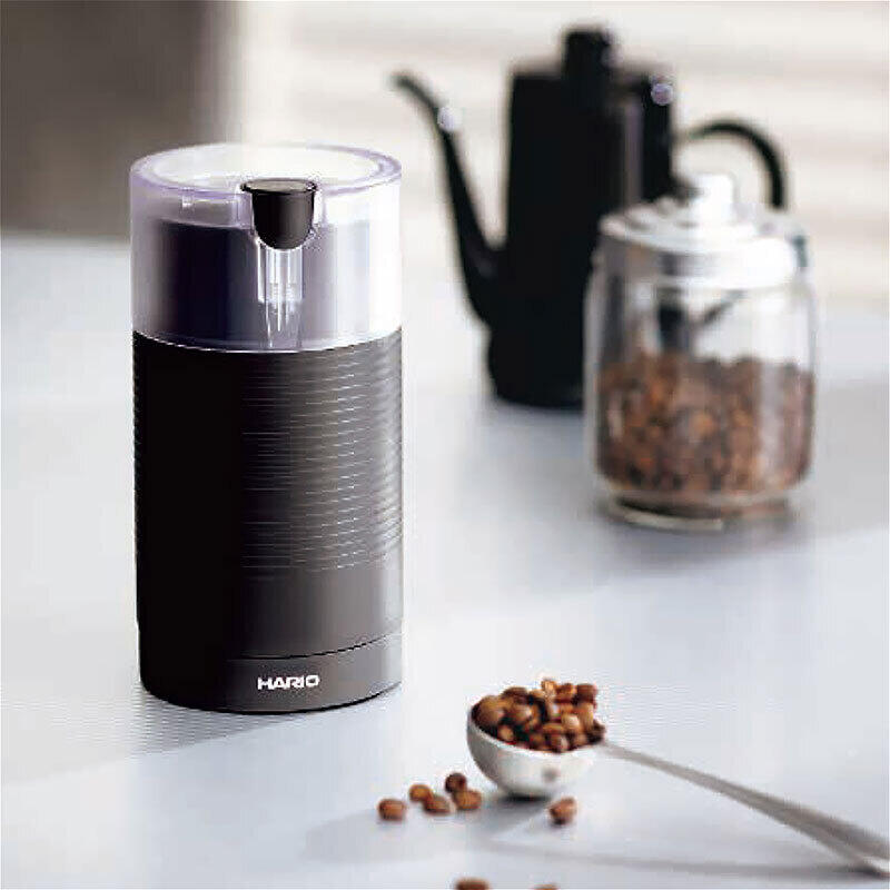 引く時間で粒度の調整ができるプロペラタイプのコーヒーミル。フタをきちんと閉めた状態でないと動作しない安全設計です。コードは製品底部にコンパクトに収納できます。