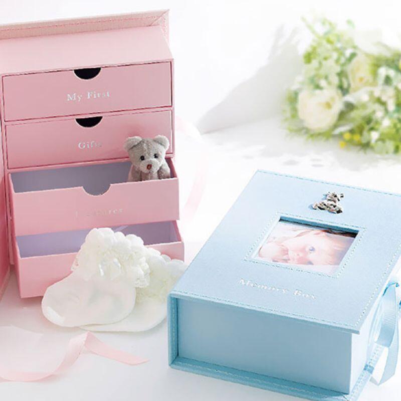 お子さまの大切な思い出を保管できるメモリアルボックスです。柔らかな色合いやオーナメント、特別感を演出するリボンなど細部までこだわったデザインで、成長したお子様に贈るのもおすすめ。表紙には写真を、4つの引き出しにはへその緒ケースや出産時のタグ、ファーストシューズ、おもちゃなどを自由に保管できます。