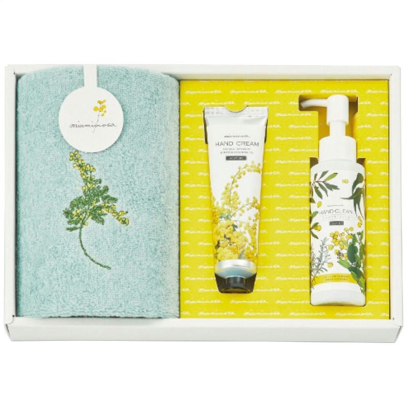 天然香料ミモザ精油がふんわりと柔らかく香る、するすると伸びる滑らかな使い心地のハンドクリームと、保湿成分ヒアルロン酸と、香料(ティーツリー・ユーカリ・ニアウリ・ラヴィンサラ・ミモザ)のアロマ精油を配合した、ほんのりとアロマの香り漂うハンドクリーンジェルと、春を告げる花ミモザをモチーフとした今治タオルのセットです。