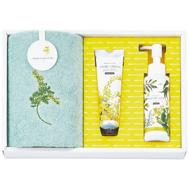 天然香料ミモザ精油がふんわりと柔らかく香る、するすると伸びる滑らかな使い心地のハンドクリームと、保湿成分ヒアルロン酸と、香料(ティーツリー・ユーカリ・ニアウリ・ラヴィンサラ・ミモザ)のアロマ精油を配合した、ほんのりとアロマの香り漂うハンドクリーンジェルと、春を告げる花ミモザをモチーフとした今治タオルのセットです。