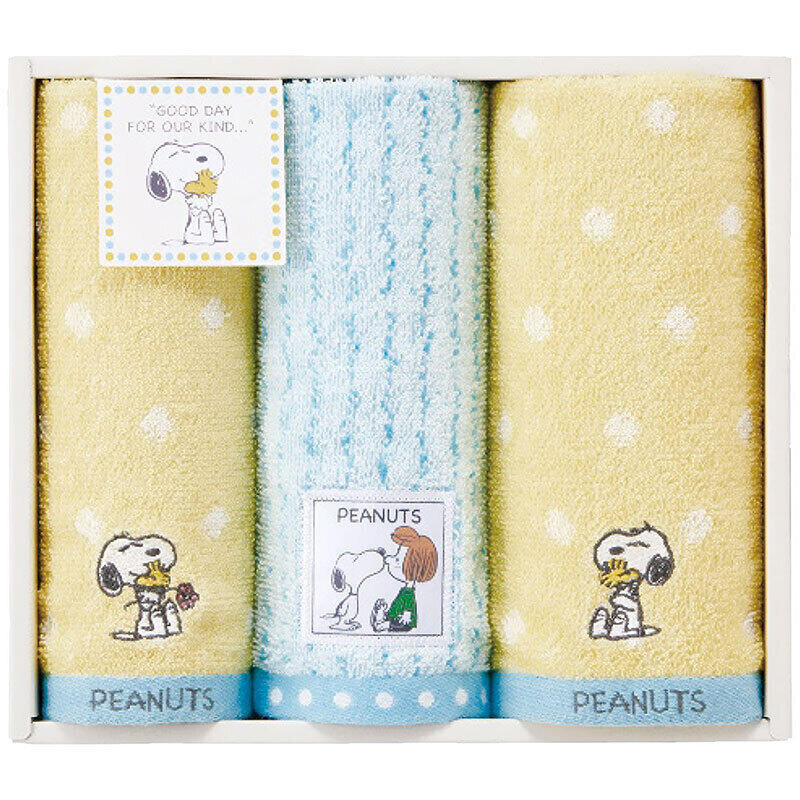 PEANUTSからハグをテーマに、スヌーピーが仲間に寄り添うシーンをモチーフにしました。ハグするスヌーピーから優しさや思いやりが伝わるデザインです。ドットとストライプのシンプルなパターンは子どもから大人まで使いやすく、内祝いにおすすめです。