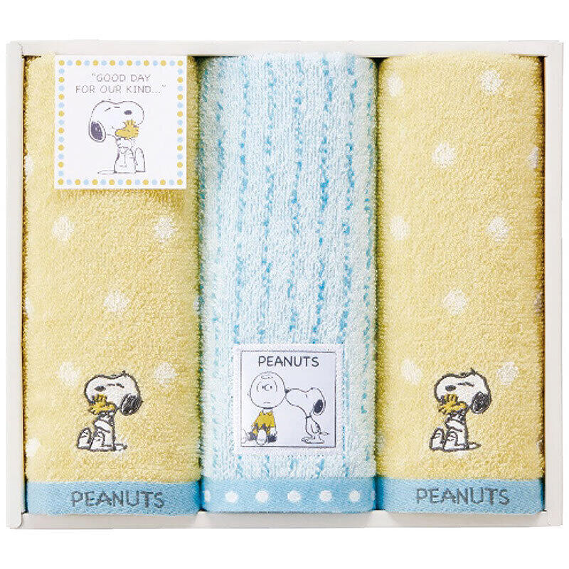 PEANUTSからハグをテーマに、スヌーピーが仲間に寄り添うシーンをモチーフにしました。ハグするスヌーピーから優しさや思いやりが伝わるデザインです。ドットとストライプのシンプルなパターンは子どもから大人まで使いやすく、内祝いにおすすめです。
